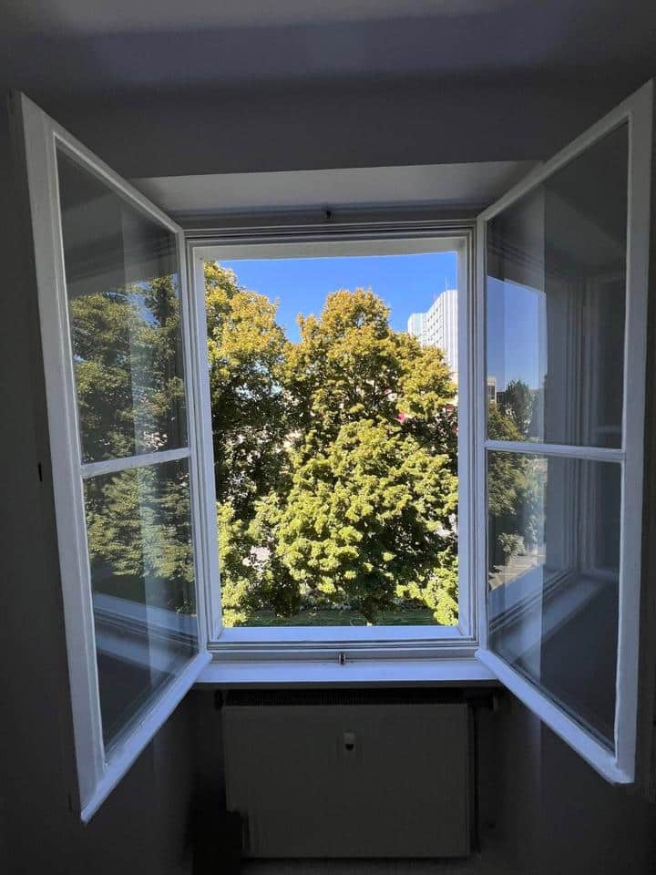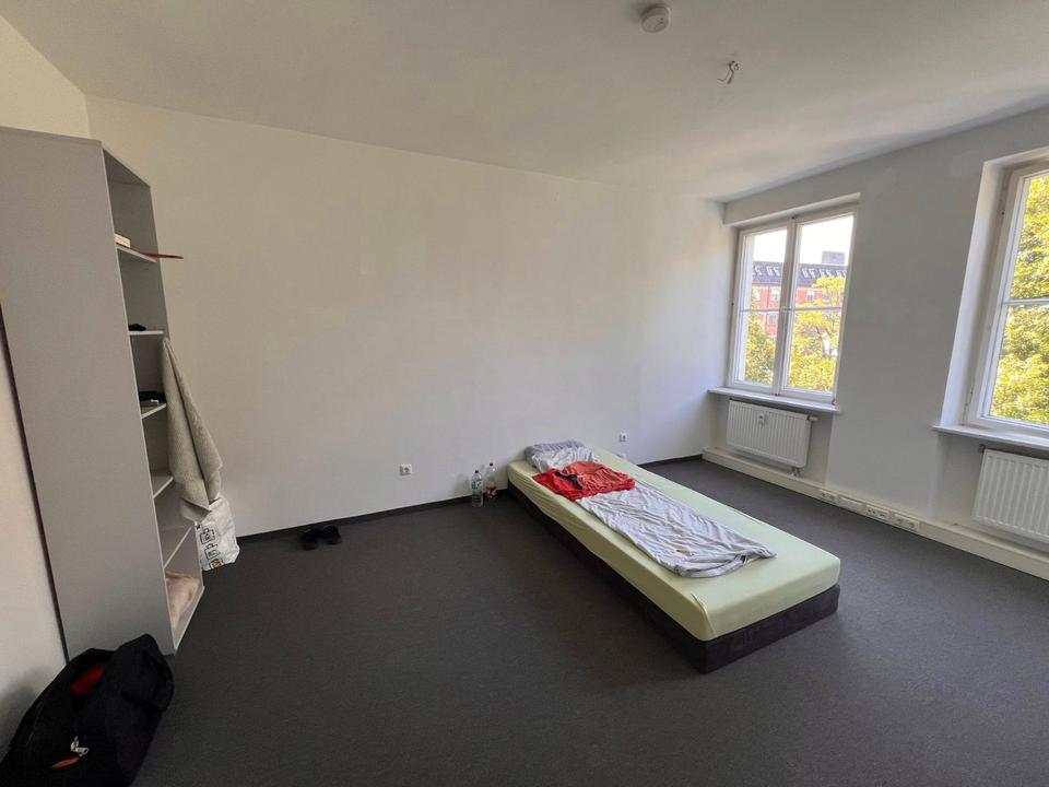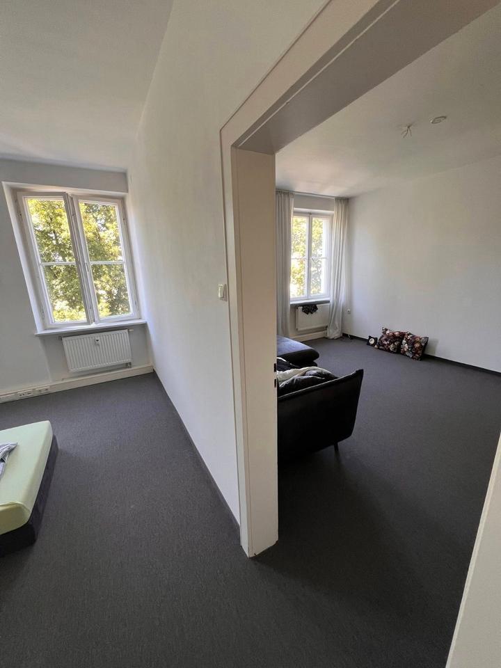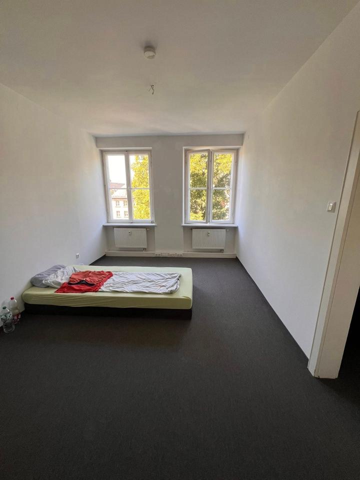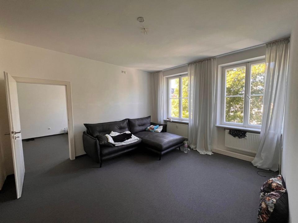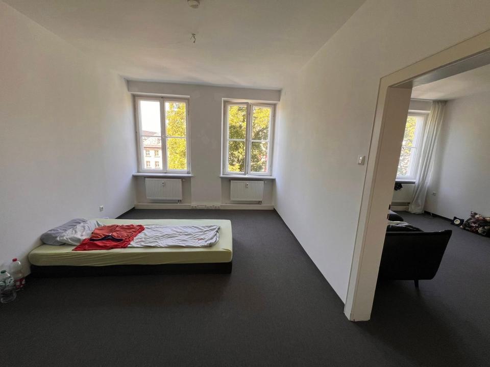 Großzügiges Wohnzimmer mit 2 großen Fenstern und im weiteren Bereich ein großes Schlafzimmer, ebenfalls mit 2 Fenstern.