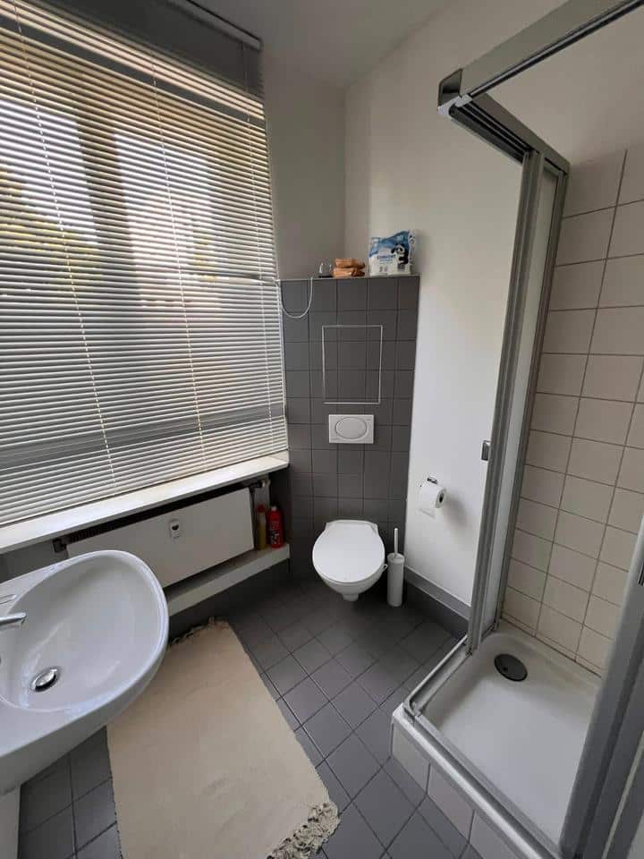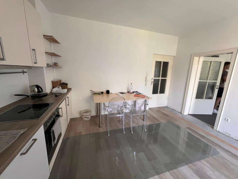 Eingangsbereich mit offener Küche inkl. EBK und großem Eßplatz. Seperates Duschbad mit WC, WaBe und Fenster.