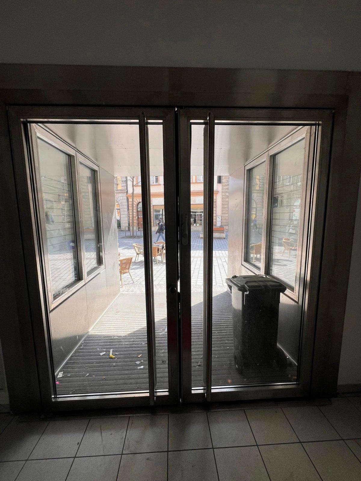 Der großzügige Eingangsbereich (Behindertengerecht gestaltet) mit modernen Glasschiebetüren verläuft parallel zur Ladenfläche und schafft eine einladende, offene Atmosphäre. Die großflächige Verglasung bietet ideale Voraussetzungen für eine aufmerksamkeitsstarke Warenpräsentation und sorgt gleichzeitig für viel Tageslicht im Innenraum.