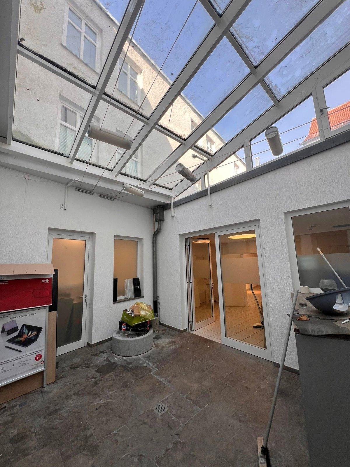 Ein architektonisches Highlight bildet das Atrium im hinteren Bereich der Gewerbeeinheit, das zusätzliche Belichtung schafft und sich hervorragend als ruhiger Beratungsbereich oder zur Auflockerung der Flächengestaltung eignet.