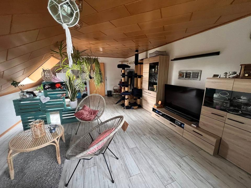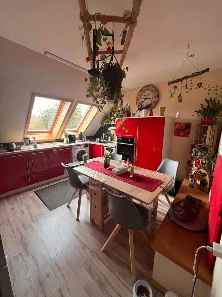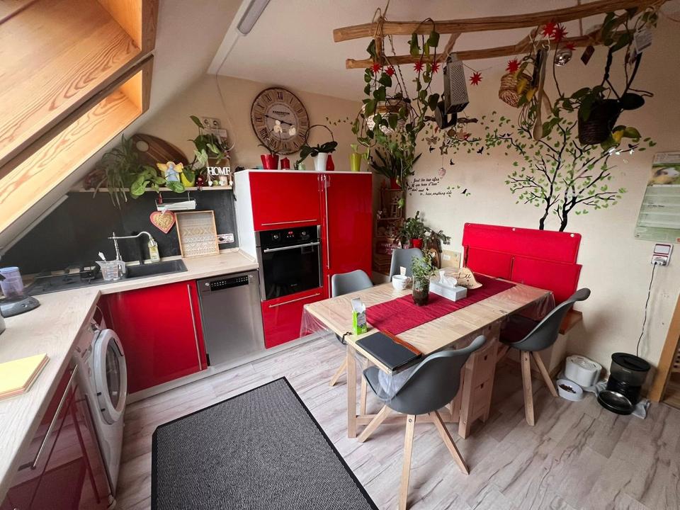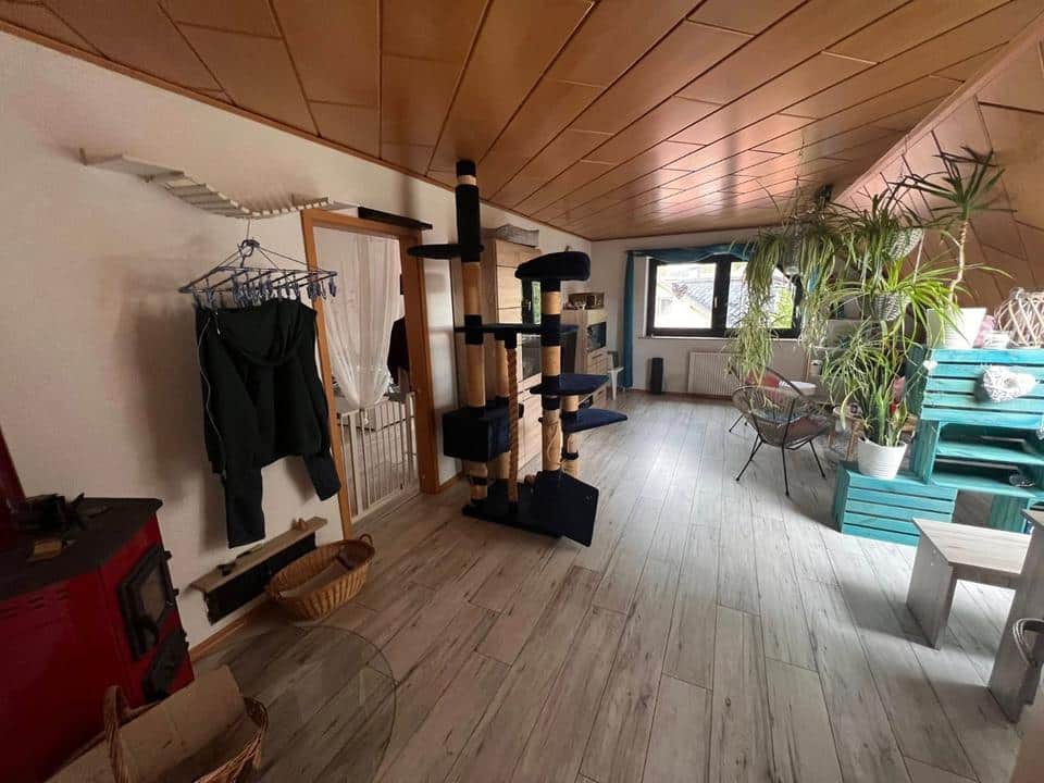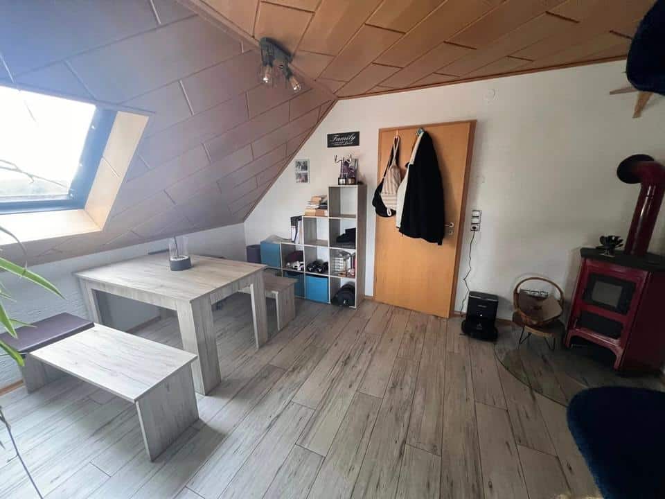 Weiterführend ist das DG gemütlich ausgebaut und hat einen großen Flur mit Panoramafenster, welches viel Licht in die Gute Stube wirft. Von hier aus zweigen folgende Räumlichkeiten ab: Das Abstellkämmerchen, ein Tageslichtduschbad mit WC und eine voll ausgestattete Küche mit EBK. Ein großes Wohnzimmer mit einem eigenen kleinen Schwedenofen tut hier ebenfalls seinen Dienst. Und selbstverständlich ist hier auch noch ein geräumiges Schlafzimmer eingebracht worden.